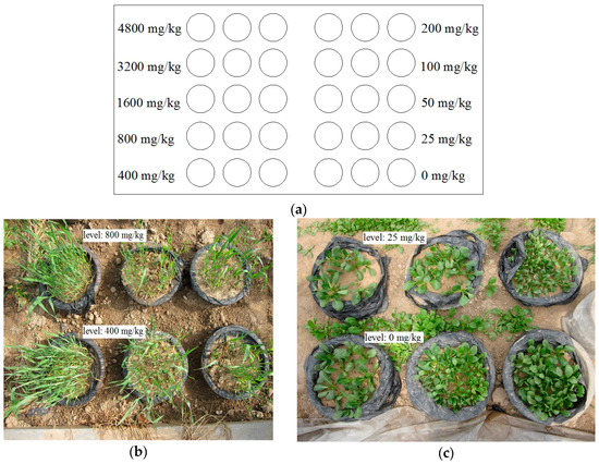 In this study, wheat (Triticum aestivum L., cultivar: “Xinchun-17”) and pak choi (Brassica chinensis L., cultivar: “Shanghaiqing”) were treated by copper with different levels using control experiments. Soil was collected from a vegetable garden without any contamination. Seeds were planted in the soil mixed with copper sulfate (CuSO4) solutions in impermeable plastic pots (Figure 1). The copper contents in soil were controlled as 0, 25, 50, 100, 200, 400, 800, 1600, 3200, and 4800 mg/kg, respectively. The pot distribution of wheat and experimental scene of some samples are shown in Figure 1, and the pot distribution of pak choi is same as that of wheat. Therefore, the total number of pots is 60. For the group with 0 mg/kg copper content, the plants were regarded as healthy vegetation. Thus, the data from this group was not used for the calibration of the reflectance model for copper-stressed vegetation. This group was only used as a reference for observing the growth of copper-stressed vegetation. There are same characteristics (except copper content) of the experimental soil with different Cu levels, including nitrogen (N) content, phosphorus (P) content, potassium (K) content, water content, particle size, pH, and so forth. There are three pots for each copper-stress level experiment (three parallel experiments) to reduce accidental errors (Figure 1).