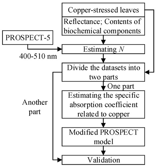 The flowchart of the method used in this study is shown in Figure 2. (1) The leaf structure parameters of all the 33 samples were estimated by fitting the simulated spectra to the measured spectra in 400–510 nm using PROSPECT-5. The detailed method for calculating N could be found in Section 3.1; (2) 22 samples were used to estimate the specific absorption coefficient related to copper. The leaf structure parameter N and the specific absorption coefficient related to copper were determined independently in this study; (3) Other samples were used for the validation of the modified model. This procedure is explained in detail in Section 3.1–3.3.