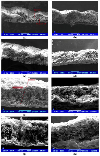 Scanning electron microscopy (SEM). images of leaves with different copper contents in soil: (a) Normal wheat; (b) Wheat with 200 mg/kg copper content in soil; (c) Wheat with 400 mg/kg copper content in soil; (d) Wheat with 1600 mg/kg copper content in soil; (e) Normal pak choi; (f) Pak choi with 200 mg/kg copper content in soil; (g) Pak choi with 400 mg/kg copper content in soil; (h) Pak choi with 800 mg/kg copper content in soil.