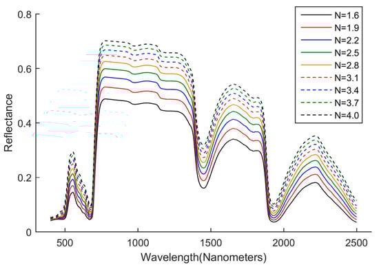 However, in this study, the specific absorption coefficients of above biochemical components in PROSPECT-5 remained unchanged in the modified model and did not need to be recalculated. So the influence from the absorption by regular biochemical components did not need to be considered. For estimating N in this study, the real influence may come from the absorption related to copper and the specific absorption coefficient related to copper was not yet determined. Hence, a wavelength range where the absorption of copper is at minimum should be selected to determine N of copper-stressed leaves to avoid the coupling influence. The absorption spectra of aqueous copper sulfate solutions were measured in [24], and the results demonstrated that the absorption of copper sulfate solutions almost equals zero in the range from 400 to 510 nm. As the wavelength λ ranges from 400 to 2500 nm in Equation (1), the reflectance in the whole wavelength would vary with different N. To verify this point and observe the detailed influence from N on the reflectance at 400–510 nm, the contents of biochemical components were fixed, and a series of reflectance spectra were generated with varying N. Figure 4 shows that changing N would cause the changes of reflectance in the whole wavelength range (400 to 2500 nm), including 400–510 nm. Therefore, we selected 400–510 nm, not 800–1300 nm, to estimate N.
