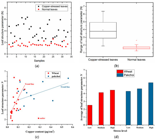 In this study, the leaf structure parameters N were estimated sample by sample, and the results of estimating N of all the 33 copper-stressed samples are presented here (Figure 5a). In addition, we randomly selected 33 groups of leaf structure parameters of normal leaves from the LOPEX93 dataset [27], which is also shown in Figure 5a. The box-and-whisker plots of the N of copper-stressed leaves and normal leaves are shown in Figure 5b. Figure 5a,b show that the leaf structure parameters of copper-stressed leaves are obviously more than those of normal leaves. Moreover, the distributed range of N with copper-stressed leaves is larger. The leaf structure parameters vs. leaf copper content with different symbols for each species were plotted in Figure 5c. The stress datasets were divided into three parts based on stress levels (low, medium, high). The averages of leaf structure parameters were plotted in Figure 5d for different classes and species. Figure 5c,d show that the leaf structure parameters tend to increase with stress levels.