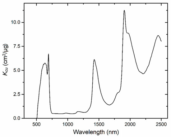 The estimated specific absorption coefficient related to copper (Kcu) is shown in Figure 6. Following characteristics could be read from Figure 6: Kcu is near zero from 400 to 510 nm. High values of Kcu are presented at 590–710 nm with a valley near 680 nm, respectively. In addition, there are three major peaks near 1400 nm, 1900 nm, and 2400 nm, respectively.
