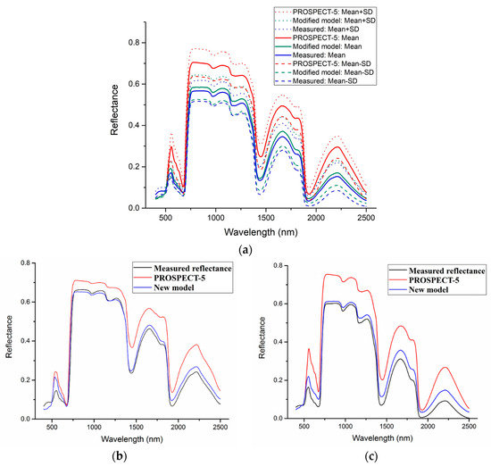 The simulated spectra (PROSPECT-5 and the new model) and measured spectra: (a) The mean (±standard deviation, SD) of simulated spectra and measured spectra of the 11 samples; (b) The selected representative sample: No. 5 sample (wheat: Cab = 49.63 μg/cm2; Ccar = 8.94 μg/cm2; Cw = 0.0096 cm; Cm = 0.0061 g/cm2; Ccu = 0.0557 μg/cm2); (c) The selected representative sample: No. 7 sample (pak choi: Cab = 27.61 μg/cm2; Ccar = 19.32 μg/cm2; Cw = 0.0320 cm; Cm = 0.0031 g/cm2; Ccu = 0.1520 μg/cm2).