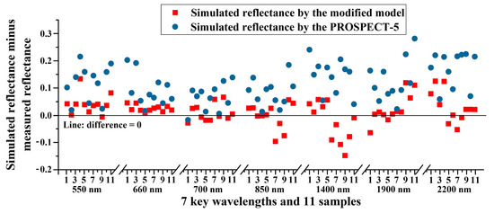 To further illustrate the effectiveness of the new model, the reflectance values at several key wavelengths were selected for comparison where the reflectance curve of vegetation shows peaks, valleys, or obvious high values, including 550 nm, 660 nm, 700 nm, 850 nm, 1400 nm, 1900 nm, and 2200 nm. We calculated the differences between simulated reflectance and measured reflectance at these seven key wavelengths, and plotted these differences vs. wavelength and 11 samples, including wheat and pak choi (samples 1–6: wheat; samples 7–11: pak choi) (Figure 8). Figure 8 shows that the differences with the modified model are nearer to zero than those with the PROSPECT-5 model.
