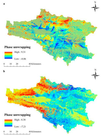 Figure 2. Phase unwrapping map on 18 December 2016 (a) and 11 January 2017 (b).
