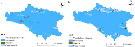 There is a specific cloud detection algorithm in MOD10A2 and MYD10A2 [40,41,42]. Due to the limitations of the cloud removing algorithm, the SCA data in the study was gathered from adjacent pixels in a relatively short contiguous time to reflect the largest range of snow cover within eight days, which compensates the low sampling density. In addition, the establishment of virtual sites in the study area can reduce the smoothness of the interpolation results from cokriging [43]. Figure 3a,b show the snow cover for the study area on 18 December 2016 and 11 January 2017, after eliminating clouds.