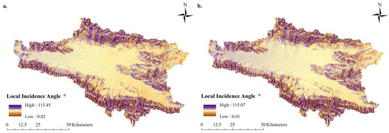 Images of the local incidence angle on 18 December 2016 (a) and 11 January 2017 (b).