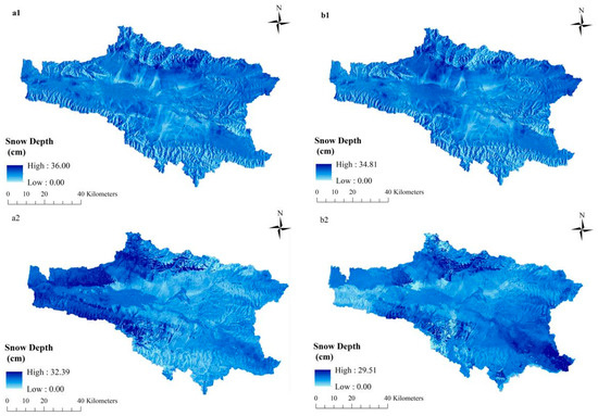 It can be seen from Figure 5(a1,a2) that the snow depth distribution were 0.00–36.00 cm and 0.00–32.39 cm, respectively. In Figure 5(a1), snow depth gradually increased from marginal mountain to centre mountain (the snow depth of the northeast basin is deeper than that of the other regions). The snow depth of the southern slopes is generally thinner than that of the northern slope. While in Figure 5(a2), the snow depth of the northwest basin is deeper than that of the other regions.