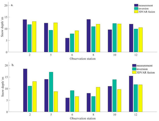 Figure 6 illustrates the comparison between the actual snow depth obtained from the observation stations, inversion, and 3DVAR fusion snow depth. It is evident that most of snow depth obtained by the two-pass method of D-InSAR method were lower than the actual data. However, the inversion result changed after the 3DVAR fusion: Figure 6a is the one of a 3DVAR fusion result in this study. The snow depth values for observation points 2, 8, and 12 were higher than those from the 3DVAR fusion. The corrected snow depth values for observation point 10 were lower than the inversion data. Moreover, the value of R2 with 0.31 increased to 0.50. In addition, Figure 6b is the other one in this study, and the snow depth values for observation points 2, 5, 10, and 12 were higher than those from the 3DVAR fusion, the corrected snow depth values for observation points 5, 6, 10, and 12 lower than the inversion data. Moreover, the value of R2 with 0.27 increased to 0.46.