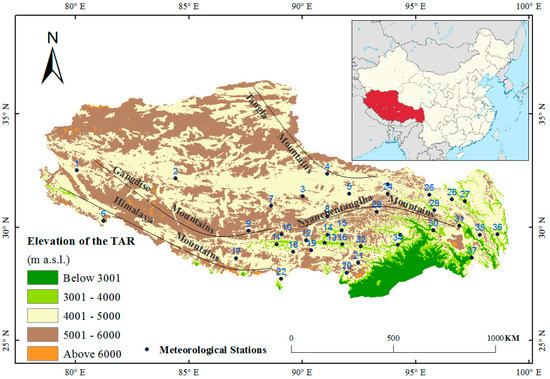 Map of the study area with altitude intervals and the location of the 37 stations indicated. The black curves indicate mountain ridges that are mentioned in the text. Upper right corner: the map of China with Tibet Autonomous Region (TAR) in red.