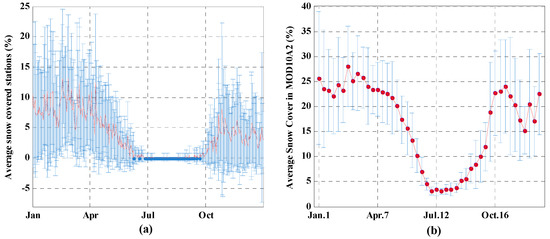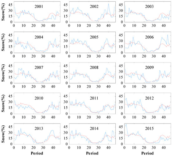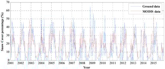 The eight-day snow cover (in %) in Tibet during 2001–2015. The red and blue curves represent the MODIS and station data, respectively.