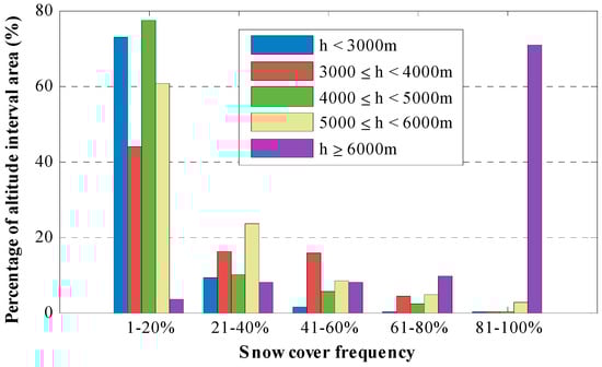 The snow cover frequency distribution of the five altitude intervals is presented in Figure 5. For areas with altitudes below 6000 m, snow cover frequencies are mainly below 21%. The areas are decreasing with increasing snow cover frequency. However, the snow frequency in regions above 6000 m is mostly above 80%, since these areas are dominated by permanent snow.