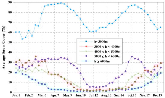 The 2001–2015 average snow cover extent of each eight-day period is plotted in Figure 6. The seasonal characteristics of snow cover at the various altitudes are quite different. According to the figure, the percentages of summer snow cover are different. In regions above 6000 m, the summer minimum value is about 60%, while only 1–2% for regions below 5000 m. Besides, the duration of the low summer snow cover values is longer for the lower regions. For areas above 6000 m, low summer snow cover values appear only in July, but for areas below 5000 m, they last from early June to the end of September. Thus, the periods of accumulation and ablation are different. Accumulation starts from the end of August or earlier for areas above 5000 m and about one month later for lower regions. In addition, the snow melting starts later at higher altitudes. Figure 6 also shows that the seasons of the high snow cover extent differ. For areas above 5000 m, the snow cover extent is larger in spring and autumn than in winter. In regions below 5000 m, the largest snow extent occurs in winter. These variations are closely connected to local topography and climate.