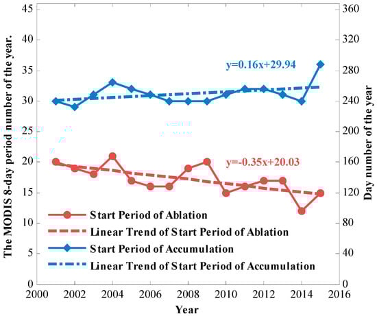Following these two criteria, we obtained the starting times of snow ablation and accumulation for each year (Figure 7). The earliest start of snow accumulation is in Period 29 (13–20 August) of 2002, and the latest is in Period 36 (8–15 October) of 2015. The earliest start of snow ablation is in Period 12 (30 March–6 April) of 2014, and the latest start is in Period 21 (2–9 June) of 2004. From this figure, we also see that the starting time of snow ablation in Tibet has shifted significantly (at the confidence level of 99%, p < 0.01) to earlier in the year during the recent 15 years (trend = −0.35 period per year). The starting time of snow accumulation shifts slightly to later in the year (trend = 0.16 period per year), but this is not significant.