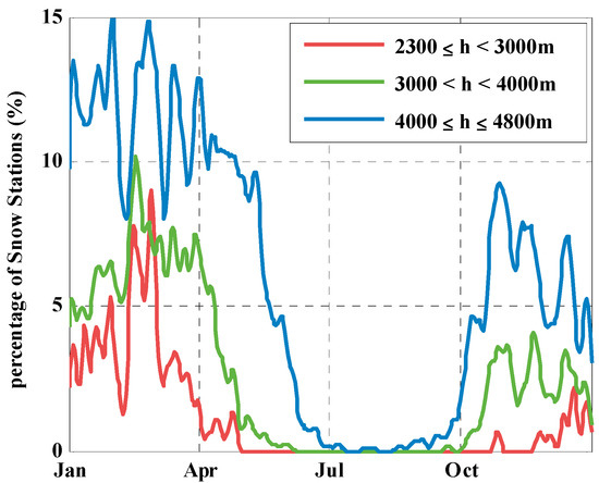The 2001–2015 average percentages of snow stations for three altitude ranges smoothed by an eight-day moving average filter.