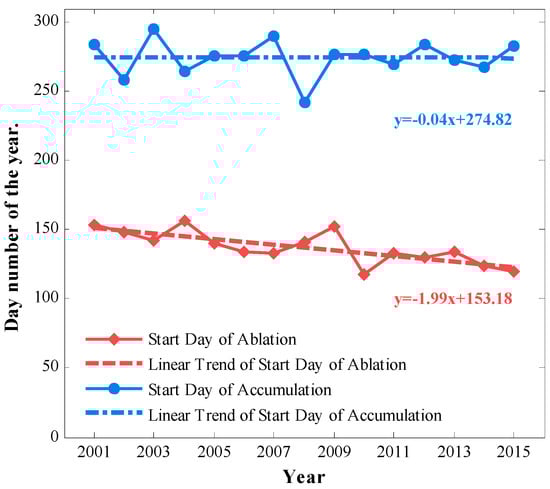 The start days of snow accumulation and ablation based on these two criteria are plotted in Figure 10. For snow accumulation, the earliest year was 2008 with the start day assessed to be 30 August (Day No. 243). The latest year was 2012 with the start day assessed to be 22 October (Day No. 296). No significant trend of the onset of snow accumulation was found during the 15 years.