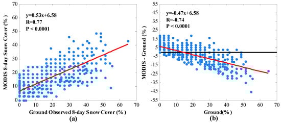(a) The relationship between MODIS and ground observed snow cover at the stations; (b) Difference between MODIS and ground observed snow cover as a function of ground snow cover. The red lines are the respective linear regressions.