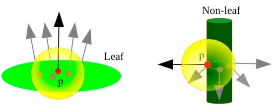 The normal of the point cloud is a very important characteristic parameter for unorganized 3D point cloud segmentation. If the direction of the two normals is almost identical, the surface structure does not change significantly. If the structure around a center point is significantly different from the other points, the direction of the two estimated normals is likely to vary by a relatively large margin [18]. Since most of the magnolia leaf surfaces are nearly flat, the normal vectors of these point clouds have similar directions. The non-leaf parts are composed from cylindrical segments. The point clouds of the non-leaf components located on the cylindrical surface and the normal vector of these point clouds have different directions (Figure 3). The normal difference of the leaf point cloud is generally smaller than that of the non-leaf component in the neighborhood. The normal difference method was proposed to segment leaf point clouds, which counts the normal difference between each point and the other points in the neighborhood.