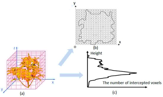 The schematic diagram of a Voxel-based model. (a) Illustration of the canopy voxelization; (b) the interception (1) and non-interception (0) of the laser beam within a horizontal layer; and (c) the vertical distribution of intercepted voxels.