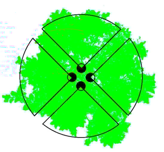 In the assessment of the estimated LAI, the LAI-2200™ instrument was chosen as validation data source provider. The LAI of a tree was measured using a 90° view cap, with the sensor placed near the base of the trunk (Figure 5). The view cap can prevent the sensor from seeing the trunk of the tree. LAI is computed by averaging the LAIs that are measured five times per tree.