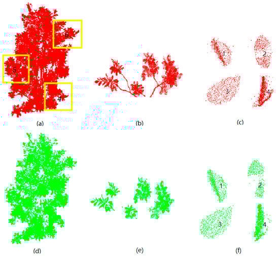 Similarly, the leaf point clouds of Magnolia B (Figure 7) were extracted using the same steps and parameter settings (as Magnolia A). The leaves segmentation effects were similar with Magnolia A (Figure 7e,f). The accuracy of three test cubes were 83.23%, 82.81%, and 87.86%, respectively. The averaged accuracy value was 84.63%.