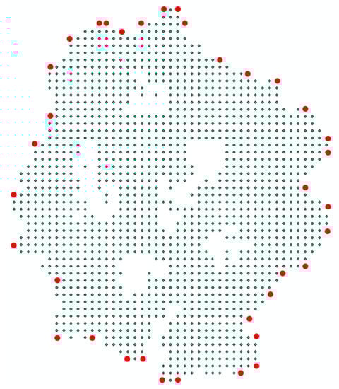 Outline of the horizontal layer. Each small black point represents the interception of the laser beam at a voxel location. A large red dot denotes the convex hull polygon vertex of the point sets, that is, the boundary layer of the tree canopy vertices.