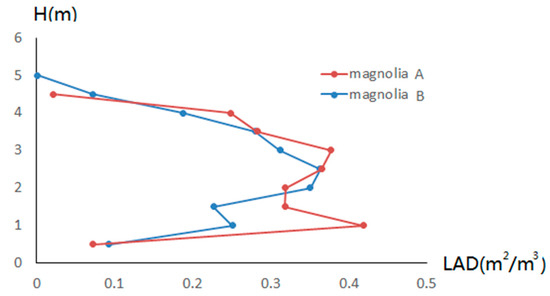 The vertical distribution of the LAD (Figure 11) was consistent with the vertical leaf distribution of the magnolia canopy (Figure 1). In each horizontal layer, the higher the leaf density, the larger the LAD. The maximum LAD of Magnolia A happened at 1.0 m of the canopy. Then, the LAD was positively related to height until 3.0 m. In the middle to higher layers of the canopy, the LAD of Magnolia A was inversely related to height. The LAD of Magnolia B at 1.0 m is much higher than 1.5 m. The LAD of Magnolia B reached the peak at 2.5 m, and then decreased gradually as the height continuously increased.