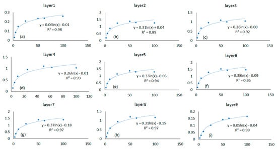 Variations in the contact frequency of different horizontal thickness layers for different voxel sizes are shown in Figure 12 in alphabetical order. It was clear that the contact frequency increased with an increase in the voxel size. They were highly correlated logarithmically. As contact frequency increased, the coefficient of determination decreased. The maximum coefficient of determination (0.99) had layer 9, where the LAD was at its lowest. In contrast, the minimum coefficient of determination (0.89) had layer 2, where the LAD was at its highest. This implied that the estimated contact frequency of a single horizontal thickness layer was very sensitive to the voxel size. A small voxel could express the internal structure of a canopy more carefully, and intercept a laser canopy. Thus, the result could be more accurate (than that derived from a large voxel). However, noise points in the point cloud data could inevitably get involved in the calculation, resulting in unreasonable calculated contact frequencies. In contrast, a large voxel size suppressed the internal structure of the canopy. Given the same thickness of the horizontal layer, the estimated LAD varied at different voxel sizes. Therefore, the expression of the canopy structure and the calculation of the contact frequency by using the appropriate voxel size were very important to the retrieval of reasonable LAD.