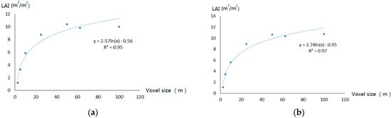 LAI of magnolia trees for different voxel sizes. (a) Magnolia A; (b) Magnolia B.