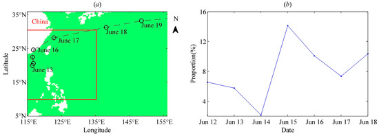 (a) The study area (10°N–30°N, 115°E–135°E) in red rectangle region and the track of the tropical storm Hagibis labeled by day. The white and green areas in (a) show land and ocean, respectively; (b) The coverage of sea surface temperature (SST) samples in the study region during the period from 12 June to 18 June 2014.