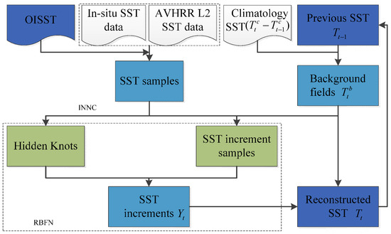 Using this RBFN method, the number of hidden knots , the position, and error variance are unknown, and are strongly related to the precision of the reconstructed SST. The error variance is estimated by the squared deviation of the difference between and SST increments . Since the number of hidden knots and the position can be affected by the distribution of SST samples, the INNC algorithm was designed to determine the hidden knots in the SST fields. Figure 2 shows the schematic diagram of this RBFN method for reconstructing SST.