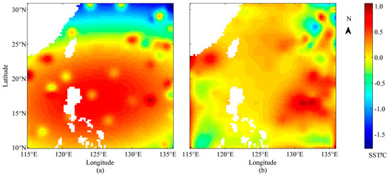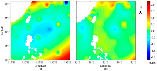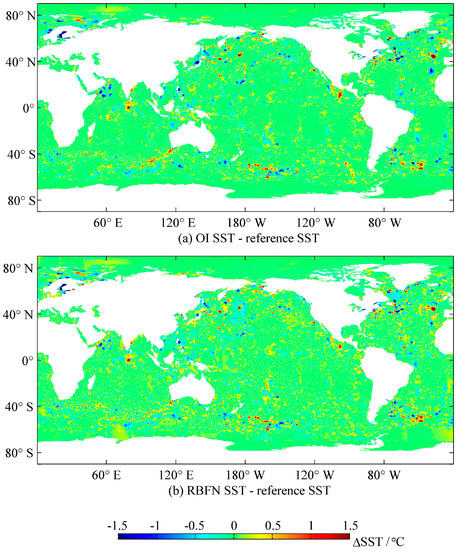 The global distributions of (a) OI SST—reference SST and (b) RBFN SST—reference SST on 13 June 2014. White areas in the images indicate no data or land.