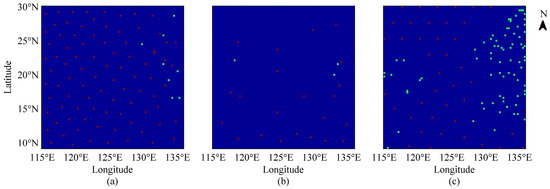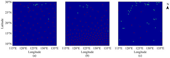 The distributions of hidden knots for radial basis function network (RBFN) on 13 June 2014 from (a) K-means algorithm; (b) Kohonen-map algorithm and (c) improved nearest neighbor cluster (INNC) algorithm respectively. The red points and green points are the locations of hidden knots for RBFNs separately selected from the background field and the SST samples.