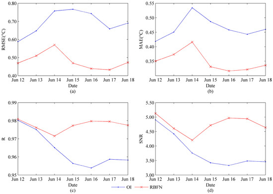 Figure 7 displays the time-series of each error metric from the OI and RBFN methods during the period from 12 June to 18 June 2014. The performance of each error metric from the RBFN method is much better than that from the OI method. The average values of these error metrics in Table 3 indicate that the RBFN method increases R and SNR from 0.96 and 3.82 to 0.98 and 4.94, respectively, and decreases RMSE and MAE from 0.69 °C and 0.46 °C to 0.48 °C and 0.35 °C, respectively. Although the RBFN method requires more computation time than the OI method, due to the selection of optimal hidden knots by using the INNC algorithm, the RBFN method has a better accuracy of reconstruction than the OI method.