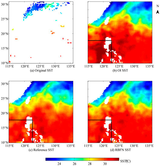 In Figure 8 and Figure 9, the reconstructed SSTs from 13 June and 18 June are separately displayed as examples. The results show that the reconstructed SSTs from the OI method (shown in Figure 8b and Figure 9b) and the RBFN method (shown in Figure 8d and Figure 9d) are quite similar to their reference SSTs (see Figure 8c and Figure 9c). But, the SSTs in the region outlined by the square from the OI method have a significantly high SST anomaly, where these phenomenon are not obvious in the SSTs from the RBFN method and their reference data. This indicates that the RBFN method has a relatively better performance than the OI method to reconstruct SSTs when the original SST samples is quite sparse, as shown in Figure 8a and Figure 9a.