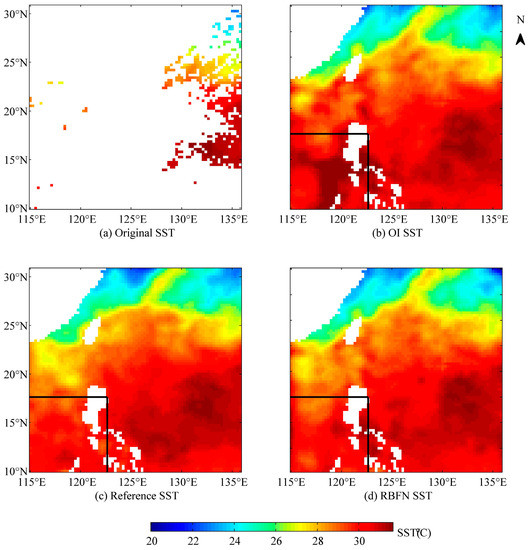 The quality of SST samples is not only relevant to the coverage of SST samples, but it also depends on their accuracy. Since the SST sample values that were used were assigned by the reference SSTs, which can be considered as non-biased SST data, the reconstructed SSTs are of relatively high quality. However, the satellite-retrieved SST is often contaminated by the atmosphere and the SST data from different sources may contain errors from their respective surveying systems, meaning that it is not easy to obtain non-biased SST data, and the accuracy will decrease if large errors exist in the SST samples.
