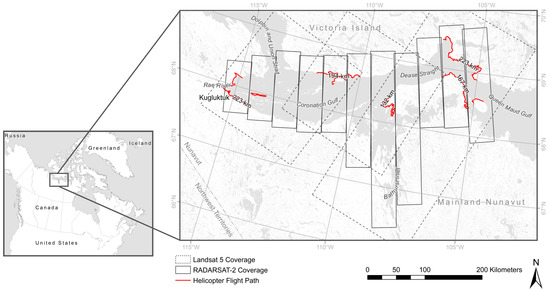 Map showing the footprint of RADARARSAT-2 and Landsat 5 scenes used in this research, and the five sites where helicopter videography data and geotagged photos were collected. Values on each line segment indicate the approximate length of shoreline covered by each videography survey (described subsequently). This figure is adapted from [16].