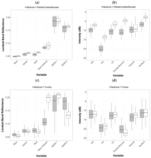 Box-and-Whisker plots (top = 25th percentile, middle = 50th percentile, bottom = 75th percentile, whiskers = 5th and 95th percentile) to show sample values for two shorelines composed of the same rock type but representing different shoreline classes (Bedrock and Pebble Cobble Boulder): (a) Landsat 5 band reflectance values; (b) quad pol RADARSAT-2 intensity, and Freeman–Durden decomposition values; and (c,d) for all training and validation sites for the Bedrock and Tundra class, Landsat 5 band reflectance values and quad pol RADARSAT-2 intensity, and Freeman–Durden decomposition values, respectively. Note that the range of values for Bedrock differ (i.e., among (a–d)), which is due to the samples from (a,b) being from one location and rock type, while those for (c,d) were for all rock types sampled throughout the entire study area.