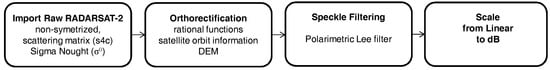 Figure 2 summarizes the processing steps applied to available RADARSAT-2 imagery. Image calibration was performed via the extraction of Sigma Nought () values using the Constant-Beta look-up tables provided with each scene. A polarimetric Lee filter was then applied to compensate for the effects of speckle. Bolanos et al. [7] discuss the advantages of this filter over others due to its ability to adapt to homogeneous and heterogeneous areas, and its ability to preserve edges. This, in addition to the fact that we wanted to make direct comparison between our method and the method proposed by Bolanos et al., is why we also used the Lee filter in this study. All RADARSAT-2 images were then orthorectified using the rational polynomial coefficients provided with the images and a Shuttle RADAR Topography Mission (SRTM) digital elevation model (DEM). Afterward, all orthorectified images were co-registered using a fast Fourier transform phase matching algorithm with a minimum match score of 0.9 set for automatically selected ground control points (GCPs). These image processing steps were implemented using PCI Geomatics software. After orthorectification, the calibrated intensity values were then converted to decibels to pronounce the tails of each image’s histogram.
