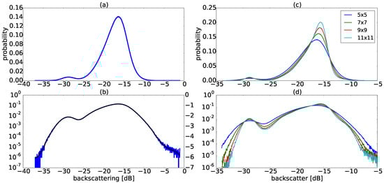 Figure 3c,d show the effect of applying speckle filtering with different window sizes on the shape of the image distribution. Speckle filtering consists of reducing the variance of a speckled image to improve the estimation of its mean [26]. In particular, the Lee filter requires the calculation of an adaptive filtering coefficient based on the local statistics defined by a sliding window of N × N pixels, in which homogeneous areas are low-pass filtered but heterogeneous areas that include texture information, such as sharp edges and isolated point targets, are preserved [27]. Table A1 shows threshold values identified via the approach described previously for the image in Figure 4a after having been filtered using various window sizes. Note that the threshold value increases as the window size increases (Table A1). This is mainly due to the average (low-pass) filter that causes an increase in the population of pixels identified as non-water while sliding over regions that are close to water edges. Thus, the thresholds calculated from images filtered with a larger window size can potentially lead to underestimation of the extent of water bodies as a result of increased mixing of land and water pixels. This is also reflected in the number of pixels selected as water, which are listed in Table A1. As such, for all images the polarimetric Lee filter with a 5 × 5 window size is used in this study.