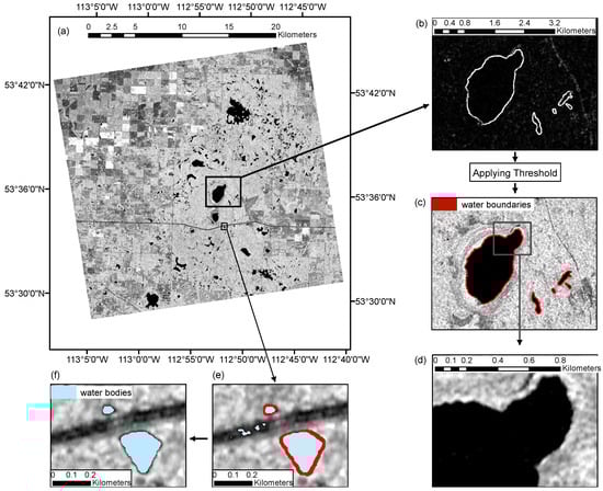 (a) HV polarization image from the Fine Quad Pol mode 19 (FQ19) scene acquired over the Prairie Pothole Region; (b) variance texture image; (c) extracted water boundaries by applying a pixel-based threshold (1.1) on the variance image; (d) segmented image generated using the simple linear iterative clustering (SLIC) superpixel algorithm; (e) water bodies generated using thresholding and superpixel segmentation; and (f) final water bodies after topological intersection of detected water bodies and water boundaries.
