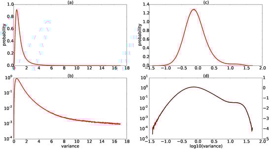 (a) Histogram of the variance texture image from the Prairie pothole site, calculated using the HV polarization image from the Wide Fine Quad 19 scene; (b) the same histogram with the vertical axis in logarithmic scale; (c) log-transformed histogram of the variance image and (d) the same histogram as (c) with the vertical axis in logarithmic scale (histograms are plotted using 1000 bins, and colors as in Figure 3).