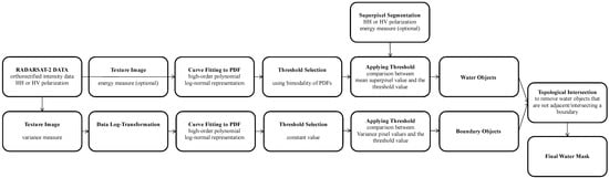 Subsequently, to improve accuracy, water boundaries extracted from thresholding of the variance image are intersected with features identified as water bodies (Figure 4e), and only those that are adjacent to boundaries are included in the final surface water product. In this research, this step is referred to as the cleanup procedure. Figure 4e,f exemplify this process, showing where some of the polygons incorrectly identified as water over a road are excluded from the final surface water product. Figure 6 summarizes the processing steps of the entire SWD workflow. It consists of two separate sub-workflows: the first one (the top line in Figure 6) is the thresholding and segmentation process which results in the generation of water objects; the second one is a boundary detection process (the bottom line in Figure 6) which results in the generation of water boundary objects. The cleanup process is the last step in which a topological intersection between the water objects and boundary objects is performed to remove false positives. In the rest of this paper, the cleanup process is referred to as the process of generating boundary objects and the topological intersection between boundaries and water objects. It is notable that the energy texture image [7] can also be used instead of HH or HV images as an input to the algorithm. Note that that there is no user intervention required in the workflow in Figure 6 since the all workflow can be automated, including the threshold selection process for both surface water and boundary objects. The only user intervention required in the present method is the separation between the single mode and bimodal (or multi-modal) histograms which has to be done after preparation of SAR imagery (i.e., after the process outlined in Figure 2 and before the workflow in Figure 6). As mentioned in Section 3.2.1, a biomodal distribution can be achieved with as few as 2% water pixels in the SAR imagery.