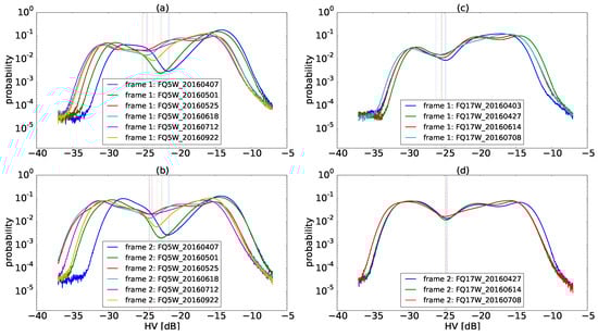 The distribution in log scale of HV backscatter values over the Bay of Quinte on different dates and for each frame for the FQ5 (a,b) and FQ17 (c,d) modes. Dotted lines represent the local minimum value of the polynomial curve, representing individual threshold values. The threshold values are also listed in Table 2.