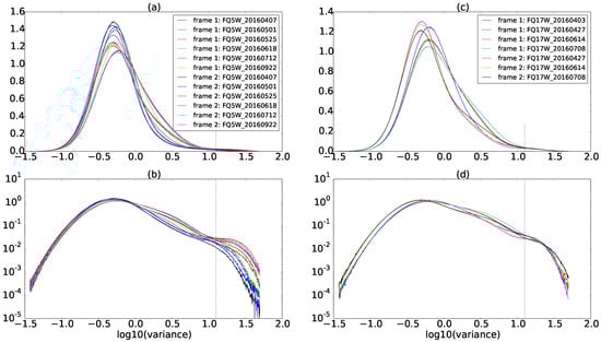 The distribution of variance texture images over the Bay of Quinte at different dates at two different incident angles. (a) Wide Fine Quad mode 5; (b) the same histogram as (a) in log scale; (c) Wide Fine Quad mode 17; and (d) the same histogram as (c) in log scale (dotted lines represent the place of threshold for variance texture images, ).