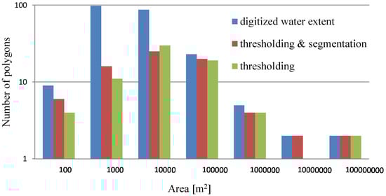 We have also plotted the distribution of the areas of detected water bodies in Figure 11 for the three cases listed in Table 5. These histograms show that both thresholding and thresholding/segmentation approaches are less accurate in detecting water bodies with areal extents between 100 and 1000 m, but perform well in detecting water bodies larger than 10,000 m. Given the resolution of these data, and the requirement for speckle filtering, this observation is sensible. Specifically, it is reasonable that smaller water bodies cannot be detected as often the filtering processes result in the mixing of adjacent land and water pixels, thus reducing the difference between values, and subsequently the ability to differentiate them.