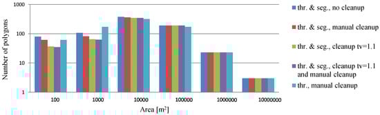 In this case, the automated cleanup procedure improved the removal of false positives with the loss of very few true water polygons (29), which were all less than 1000 m; making up less than 0.15% of the areal extent of all water bodies. The numbers and sizes of water polygons found using the proposed method are provided in Table 6 and plotted in Figure 12. Two points can be highlighted regarding the histograms in Figure 12. First, the difference between the number of detected water polygons after applying the automated cleanup and automated/manual cleanup is very small, demonstrating that after the automated cleanup most false positives are removed. Second, the thresholding method in this scene shows a slightly better performance for water bodies in the range between 100 and 1000 m compared to thresholding/segmentation method. As mentioned previously, it is also possible to improve the accuracy for these small water bodies by decreasing the variance threshold, though at the cost of an increased number of false positives.