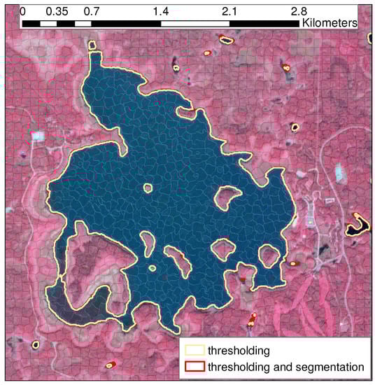 Table 4 provides the number of water bodies that were detected after the manual cleanup of the water product generated for the scene acquired on 27 April. Interestingly, the number of detected polygons using thresholding is lower than those detected using thresholding/segmentation (72 and 81, respectively). This is an important observation, as it shows that the thresholding of segmented SAR images improved the number of correctly detected water bodies. Another observation is that the total area of detected water bodies using only thresholding is lower than that detected using thresholding/segmentation. This is in addition to the fact that the largest polygon lost in thresholding had a relatively small area (1288 m) and the percentage of difference (i.e., ) between the area of the manually cleaned up products from thresholding and thresholding/segmentation approaches is the highest percentage (−0.7) in Table 4.