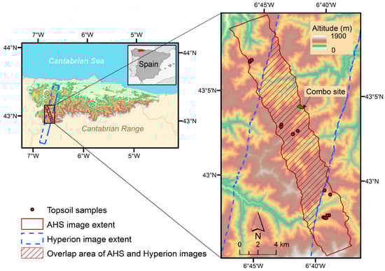 The study area is located on the western side of the Cantabrian Range (NW of Spain), and consists of a NW–SE rectangle of approximately 60 km2, which corresponds to the AHS image extent (Figure 1). The area corresponds to a mountain region with an altitude range from 400 to 1700 m above sea level, and an average slope of ~25°. The climate is Atlantic, with an average annual air temperature of 8 °C and an average annual precipitation of 1500 mm. The bedrock is very homogeneous, and is mainly composed of quartzite, sandstone, and slate. The soils are classified as Lithosols, Histosols, and Regosols, according to the World Reference Base [52], and are sandy, shallow, and stony. We chose this region because it has been affected by frequent wildfires [53], and soil in this area contains high amounts of organic matter [54], which makes it well-suited for the study. As a result of the degradation caused by the repeated burning of this region, the landscape is dominated by extensive areas of heath formations, and deciduous forests, to a lesser extent [55]. The abundance of heaths within the burned slopes located in the study area varies along a N–S gradient, with higher abundance in the northern areas. The wildfire incidence map obtained with Landsat [56] data showed regions of the study area affected by up to four wildfires from 1984 to 2011. The last wildfires in the study area were recorded in 2005 (center of the study area), 2006 (south), and 2011 (north and center-south).