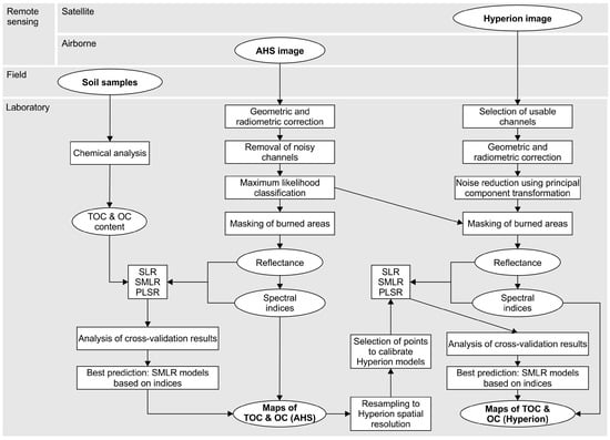 Flowchart of soil organic carbon (SOC) estimations (TOC and OC) using AHS and Hyperion hyperspectral data. TOC = total organic carbon; OC = oxidizable organic carbon; SLR = simple linear regression; SMLR = stepwise multiple linear regression; PLSR = partial least squares regression.